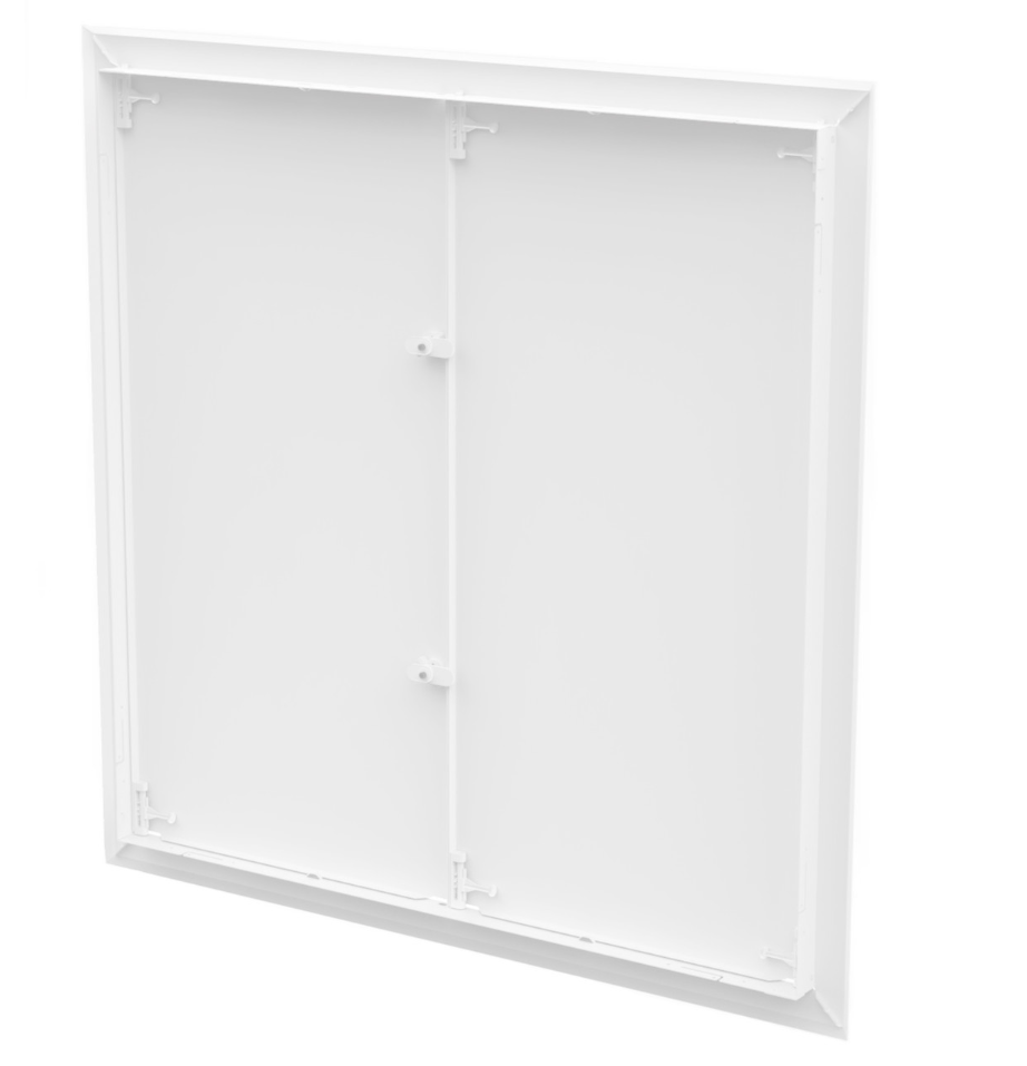 PARAMETRY TECHNICZNE PRODUKTU:Wymiar zewnętrzny (x x y): 1290 mm x 1290 mm Wymiar montażowy (a x b): 1196 mm x 1196 mm Grubość z kołnierzem: 44 mm Kolor: biały (RAL9016) Materiał: blacha ocynkowana Grubość blachy: 1mm Wyciągane skrzydła |