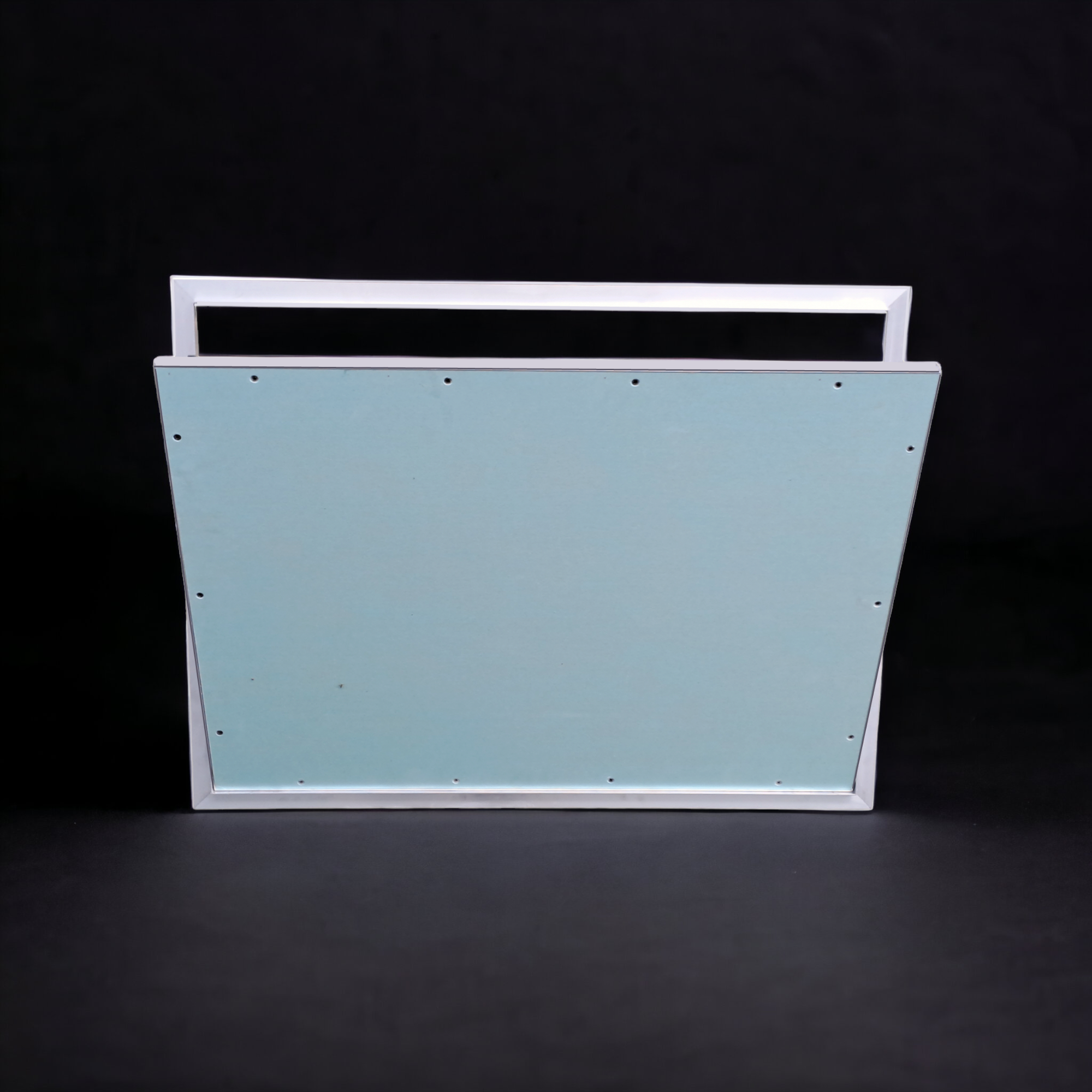 Model drzwiczek rewizyjnych RIVET jest produkowany z zieloną płytą gips-karton, pokrytą warstwą impregnatu. Dzięki impregnacji płyta jest bardziej wytrzymała i doskonale sprawdza się w pomieszczeniach o podwyższonej wilgotności takich jak: łazienka, czy toaleta. Wspomniana płyta mocowana jest do ramy wewnętrznej za pomocą wkrętów samogwintujących.
