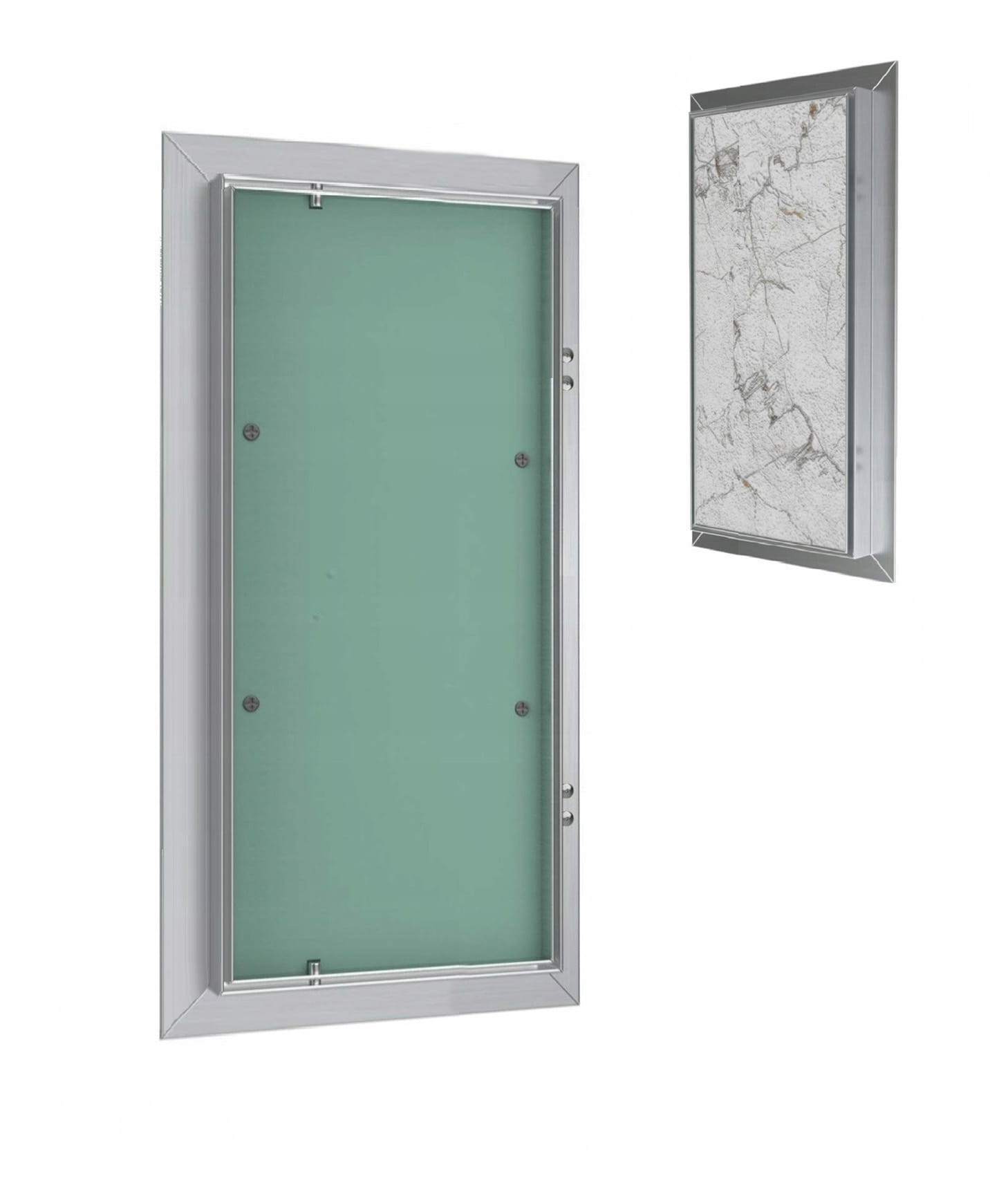 Drzwiczki rewizyjne CERAMIKO ukryją Twój otwór rewizyjny!Drzwiczki rewizyjne pod płytki CERAMIKO wykonane zostały z profili aluminiowych, spawanych do ramy zewnętrznej i wewnętrznej. Cała konstrukcja połączona jest za pomocą stałych zawiasów, co umożliwia otwarcie skrzydła drzwiowego na bok, w razie potrzeby. Model produkowany jest z zieloną, wodoodporną, impregnowaną płytą GK w kolorze zielonym. Płyta ma grubość 12,5 mm. Ponad płytą gips-karton znajduje się dodatkowy kołnierz o wysokości 13 mm tworzący wnękę, która umożliwia wklejenie płytki ceramicznej. Po przyklejeniu płytki, całość licuje się z pozostałymi płytkami na ścianie tworząc spójną i elegancką całość. Wygodne otwieranie i zamykanie gwarantuje zamki zatrzaskowe klik-klak (tip-on), które znajdują się na ramie zewnętrznej. Naciśnięcie skrzydła drzwiczek rewizyjnych w miejscu zamka spowoduje otwarcie drzwi, natomiast ponowny docisk umożliwi ich zamknięcie. Konstrukcja drzwiczek CERAMIKO została zaprojektowana z uwzględnieniem obciążenia jakiemu muszą sprostać drzwi w połączeniu z płytką, dlatego bez obaw można wklejać w nie ceramikę. |