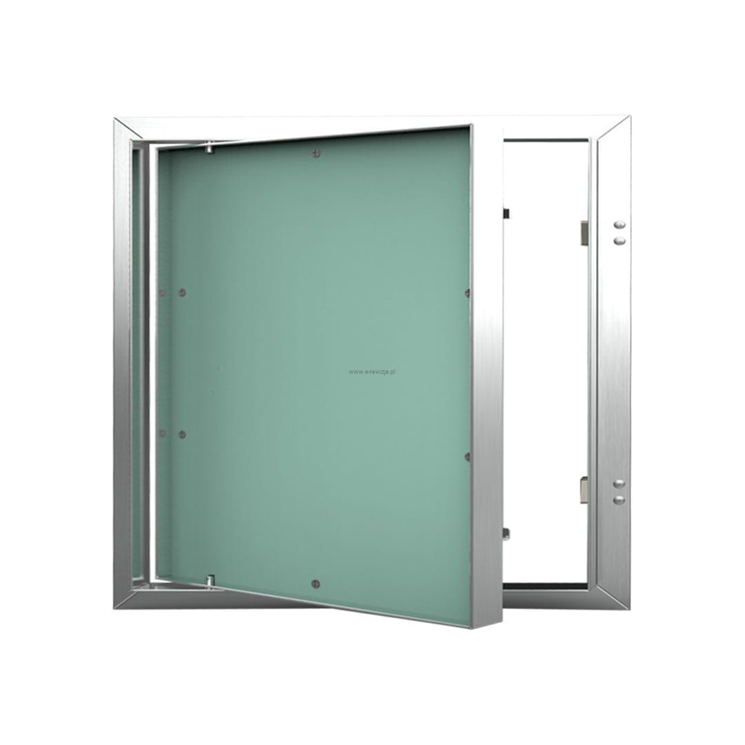 Drzwi rewizyjne CERAMIKO wykonane są z profili aluminiowych, które są spawane do ramy zewnętrznej i wewnętrznej. Cały zespół jest połączony za pomocą stałego zawiasu, co umożliwia otwarcie skrzydła drzwiowego w razie potrzeby. W wersji standardowej model ten produkowany jest z wodoodporną płytą w kolorze zielonym, mocowaną do ramy wewnętrznej za pomocą kleju o dużej wytrzymałości, co gwarantuje szybką i łatwą obróbkę powierzchni.