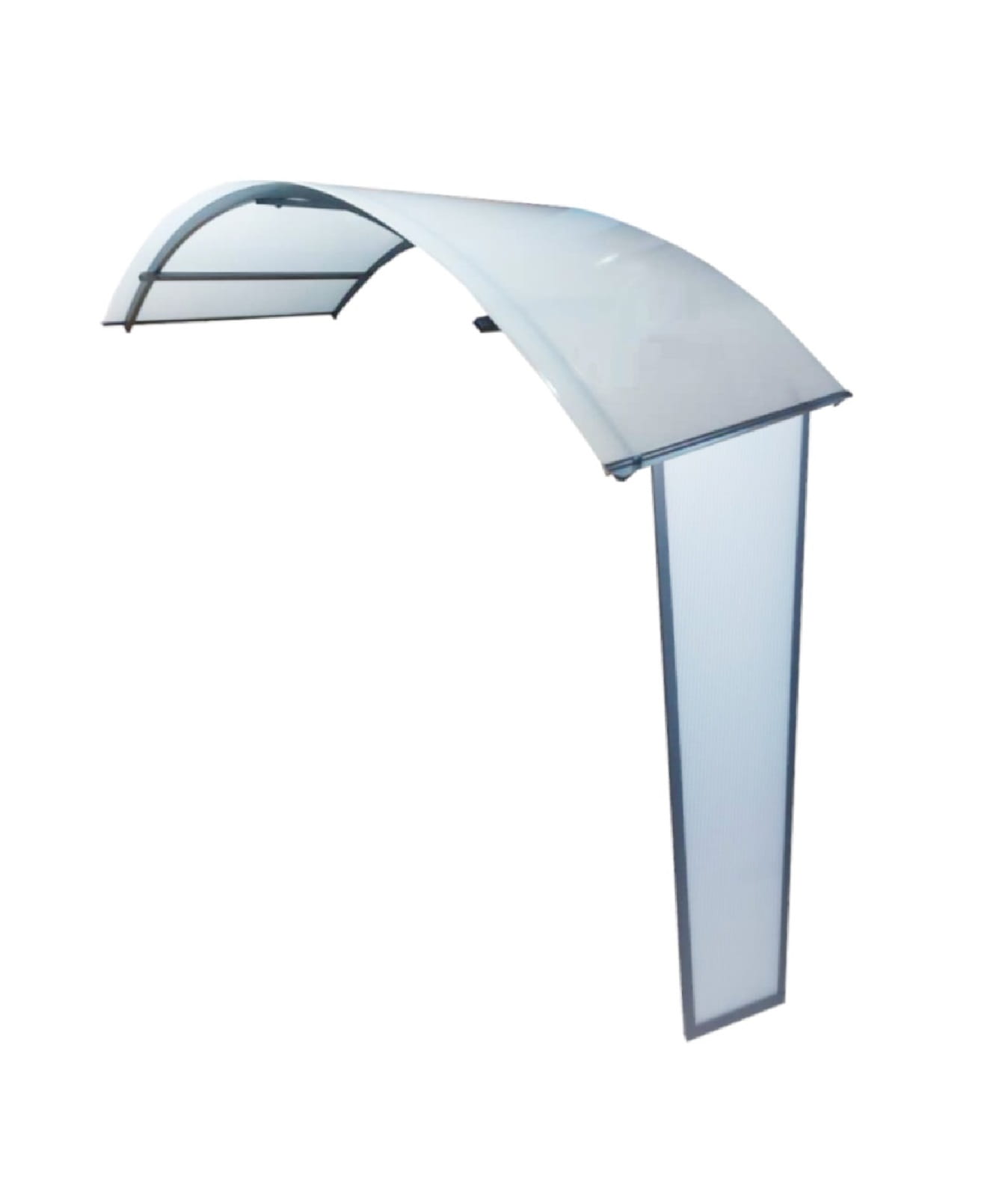• Zadaszenie w postaci daszku nad drzwi – konstrukcja wykonana z poliwęglanu komorowego w kolorze bezbarwnym oraz aluminiowej ramy malowanej proszkowo na kolor grafitowy. Poliwęglan charakteryzuje się odpornością na uderzenia i promieniowanie UV, nie odbarwia się i nie kruszy. Aluminiowa rama sprawia, że konstrukcja jest mocna i stabilna.