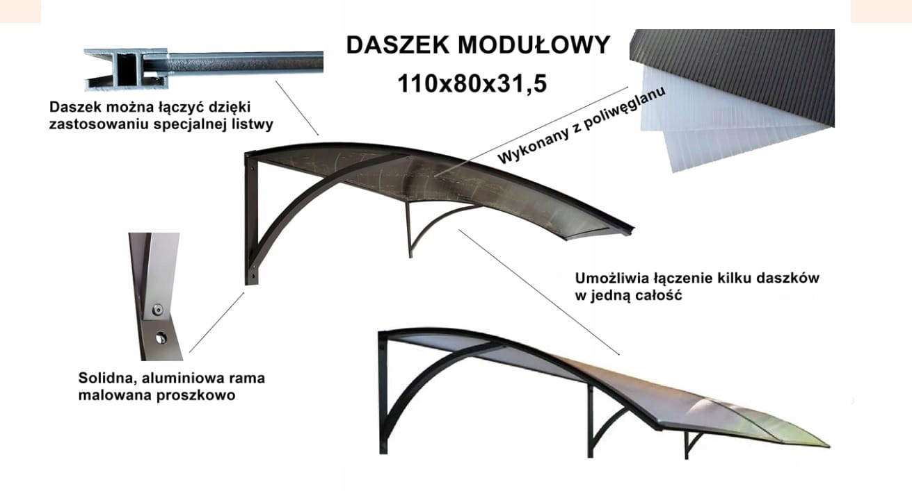 - Daszek ma konstrukcję modułową co oznacza, że można go rozszerzać o kolejne daszki(daje wtedy szerokość 220 lub 330 cm itp.)