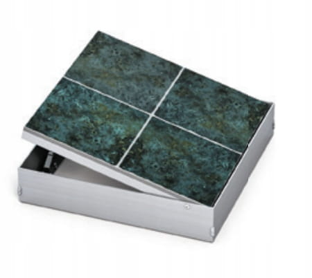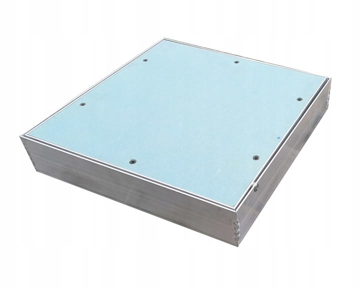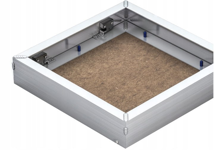 Drzwi produkowane z profili aluminiowych tworzących wewnętrzną i zewnętrzną ramę. Cały zestaw jest podłączony ze stałymi zawiasami umożliwiającymi otwarcie drzwi w razie potrzeby. W ramie wewnętrznej montowany jest panel impregnowany na zielono, na stałe ze śrubami. Zawiasy są przesunięte, a drzwi są gotowe do montażu z płytkami ceramicznymi.