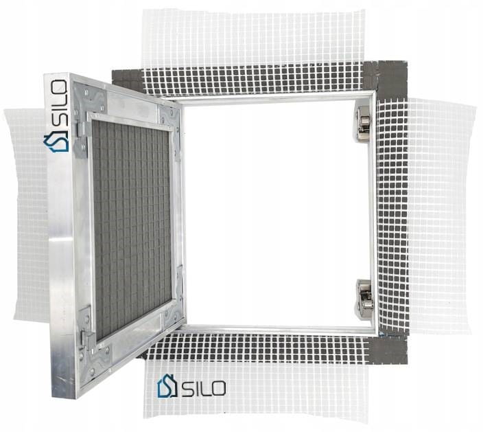 - Drzwiczki do mokrego montażu w elewacji mocowane na stałych zawiasach, z uszczelką wokół ramy wewnętrznej.