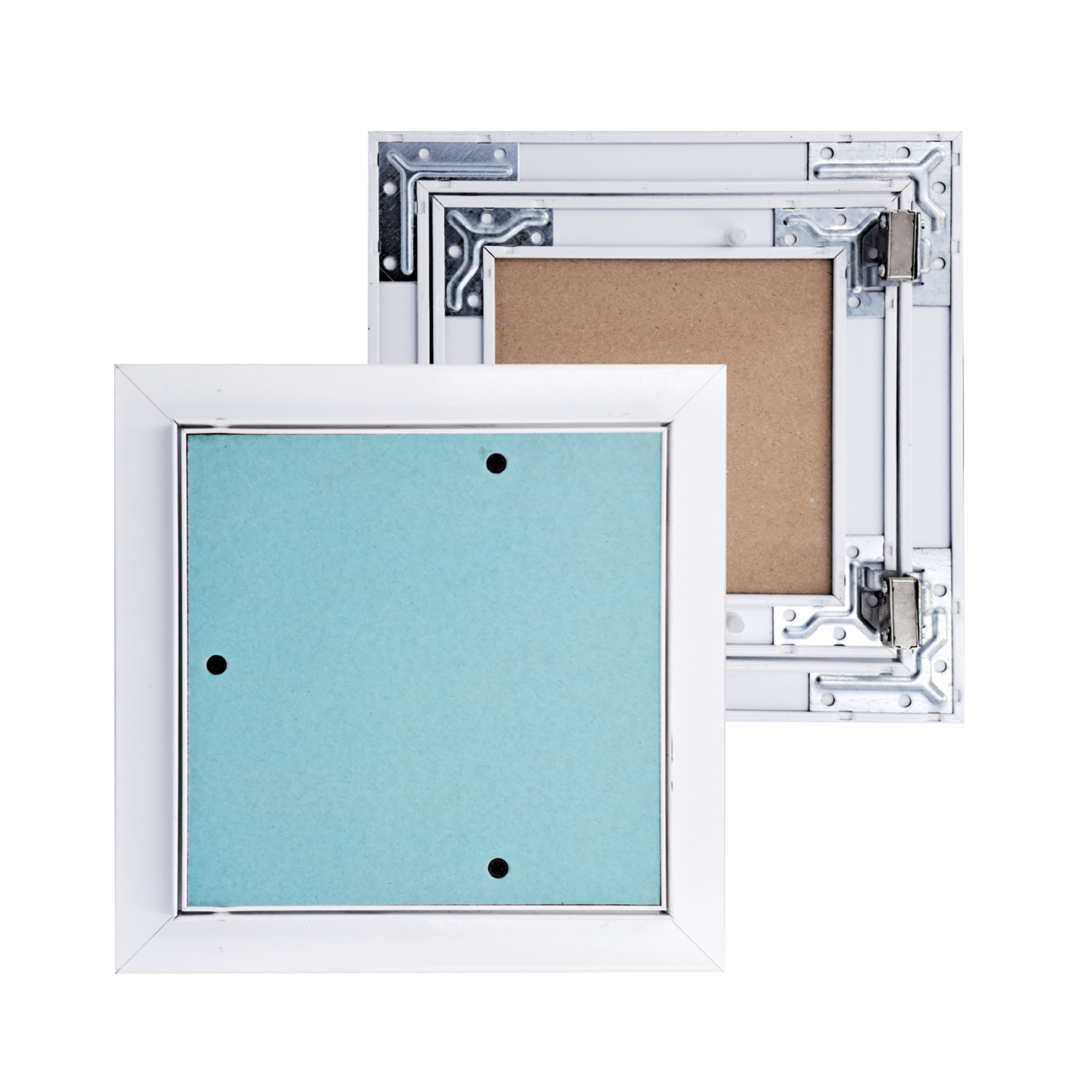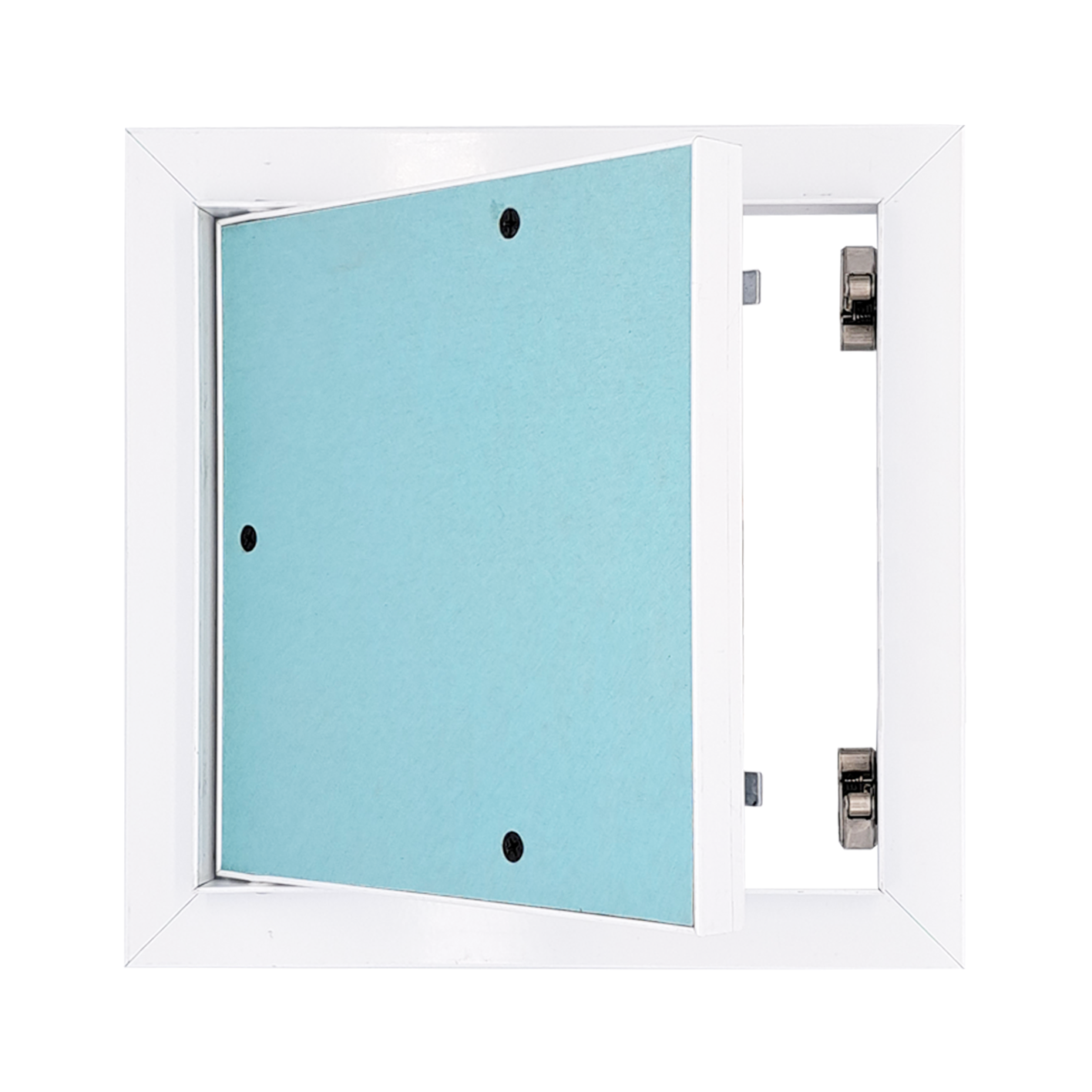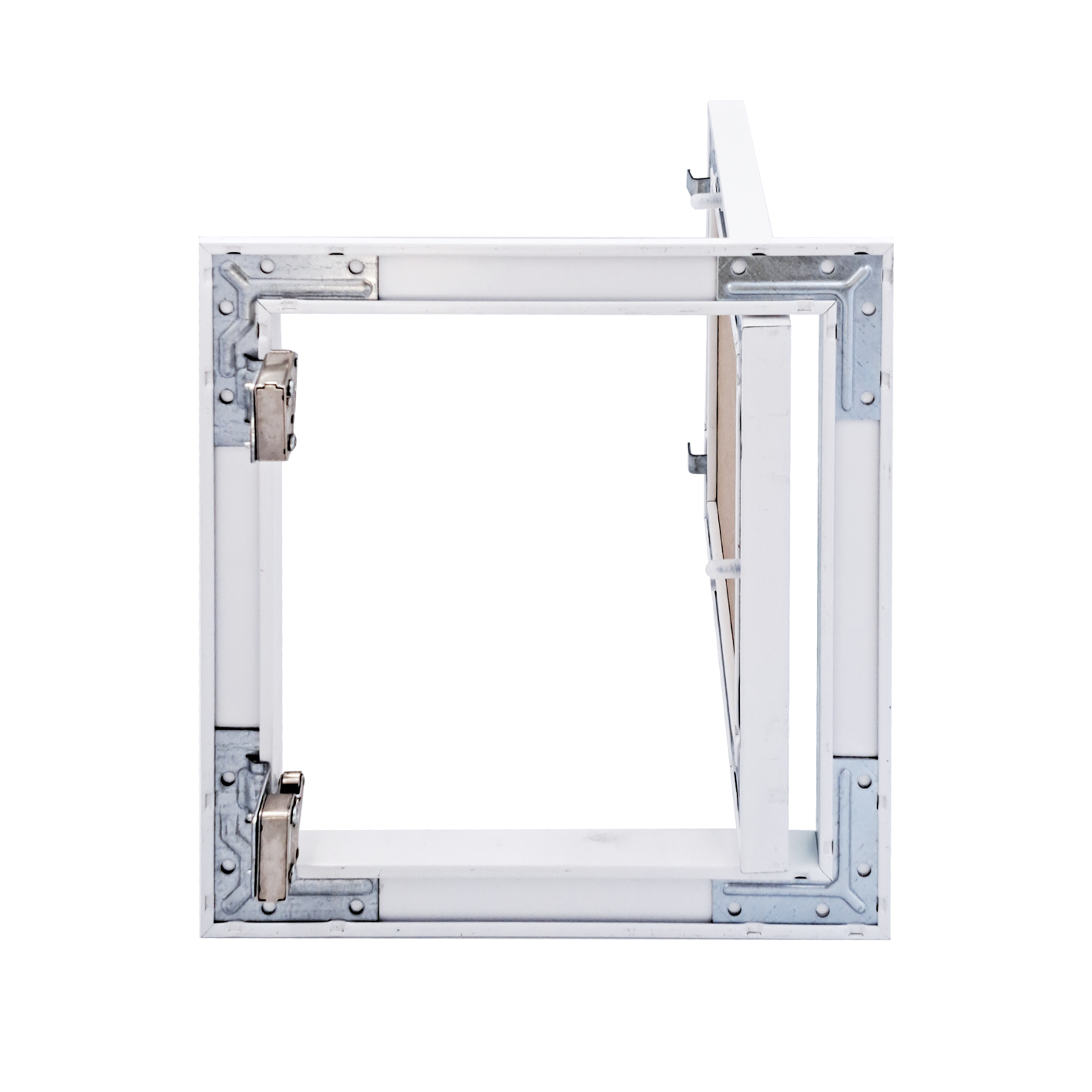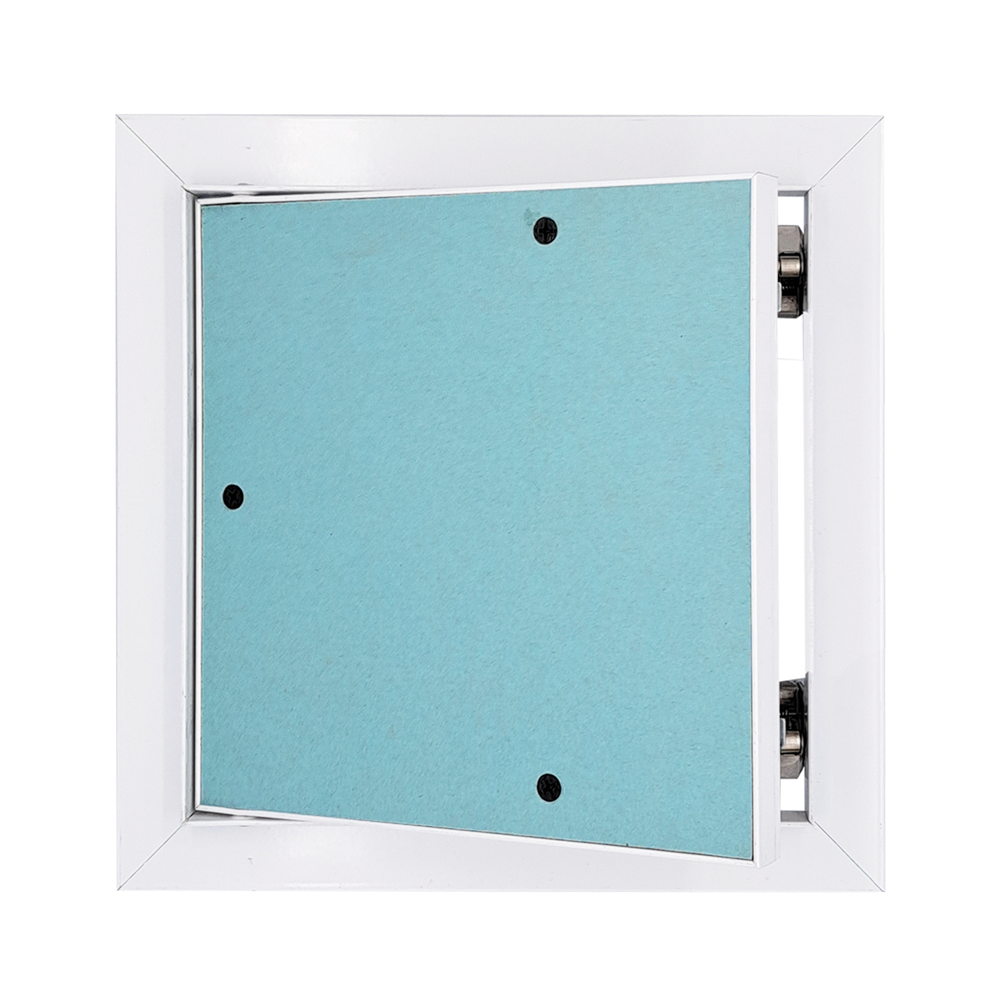 RIVET WHITE – DRZWICZKI REWIZYJNE ALUMINIOWE, MALOWANE NA BIAŁO NA ZAWIASACH Z WODOODPORNĄ PŁYTĄ G-K 300x300x12,5 MM